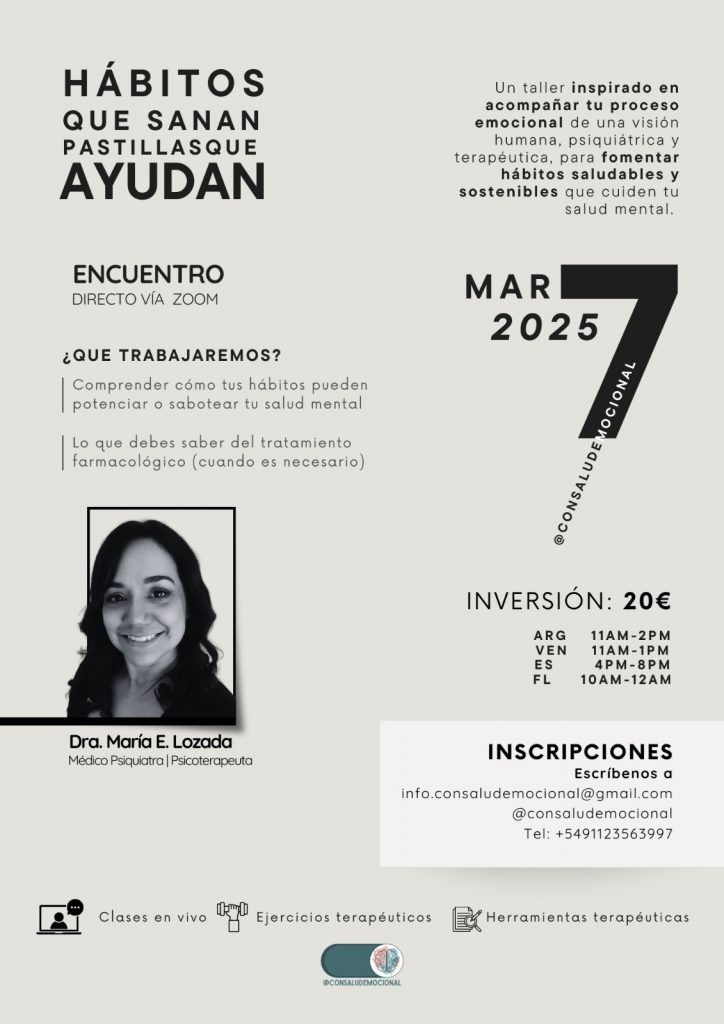 Desde Consaludemocional tenemos el placer de invitarte a participar en el Taller: «Hábitos que sanan, pastillas que ayudan: Entendiendo tu