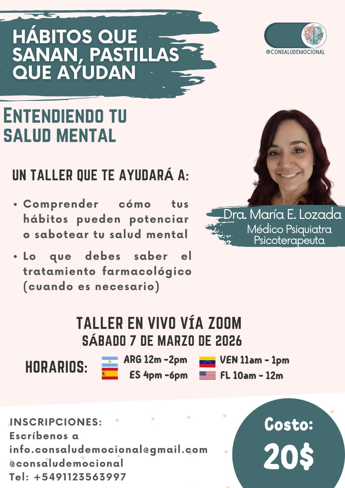 Desde Consaludemocional tenemos el placer de invitarte a participar en el Taller: » Hábitos que sanan, pastillas que ayudan: Entendiendo tu salud mental «, que será dictado por la Dra. María Elisa Lozada, Médico Psiquiatra y Psicoterapeuta.
